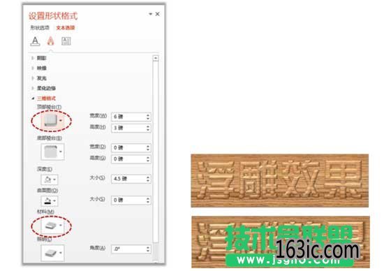 3、照下图参数设置顶部棱台的三维格式,便可得到浮雕效果。 根据需要还可调节材料、添加阴影获得更生动的效果。