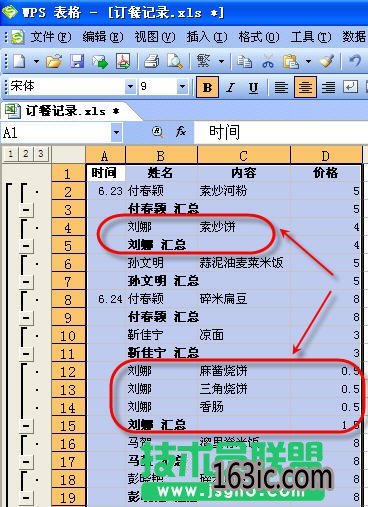 名称汇总后,有些条目前面没有了日期,这实际上是我只做表格的一个缺陷,没有充分认识到软件和人思维区别。我们可以想当然认为在新时间开始前都是上一天,但软件不会这样,我应该在每一个条目上都补上日期,这样可以让每个人知道那天都选择的什么饭菜。