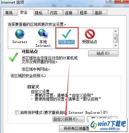 6、也可以选中可信站点后,点击自定义级别,如下图所示: